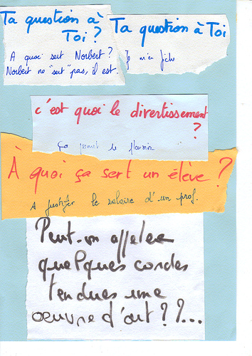- Nous préparions tout d’abord notre cadre d’intervention : orner chaque table d’un dictionnaire ouvert à la définition de cadre, ainsi qu’avec des livres de photos, de peintures, traitant d’art, revues, journaux aux pages culture, etc.… Là-dessus nous saupoudrions des bouts de papiers multicouleurs, où étaient inscrites de multiples questions. ( Telles que « à quoi ça sert blabla ? » ou « c’est quoi blabla ? » ou « blabla, c’est … » ainsi que « t’es qui toi ? » et « ta question à toi ? » et remplacez blabla par : le lycée, un élève, la création, un artiste, le silence, le vide, le loisir, un cadre, inventer, imaginer, produire, travailler, un musée, etc. etc …)